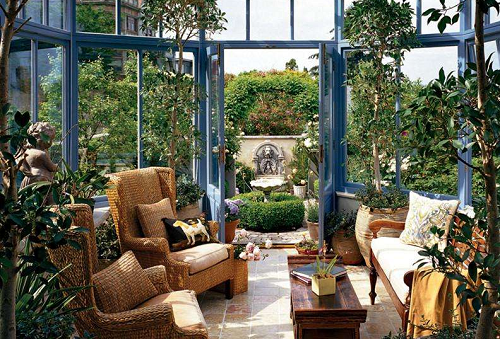 冬天就应该住在这样的阳光房里3、花园阳光房 花园式的阳光房表现是非常丰富的,它的样式非常多,可以一面临墙、二面临墙、三面临墙,或者四面无墙设计,主要会设计在别墅边上,与别墅紧密连接,花园阳光房就向一个小型花园一般,不仅种满了好看的绿植,而且鲜花盛开,白天享受日光、夜深看星星、下雨听雨声、闲暇品茶。