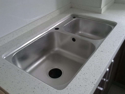 2、先将水龙头和水管先安置在水槽上。额外,水龙头上的进水管一头对接进水开关处。水龙头安装前,需要清理自来水管道内的杂物,以防杂物进入龙头损坏阀芯 。水槽买到家后,工人一般才会根据水槽的尺寸大小进行切割橱柜台面,水槽放入台面后,需要在槽体和台面间安装配套的挂片,将水槽安装牢固,避免细小的空隙导致槽体左右摇晃。