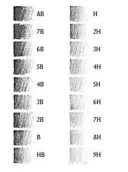 铅笔按照笔芯中的石墨含量,可以分为H、HB、B三大类: 1、B是黑度(black),代表柔软的石墨; 2、H是硬度(hard),代表铅笔芯里面坚硬的黏土。 3、H和B前面的数字越大,就代表对应的成分越多。 就这样,铅笔共有18个级别,其中HB则代表硬度和黑度都适中,从B到8B越来越黑但也越来越软,从H到9H则越来越硬也越来越淡。