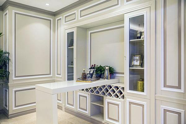 4、全高型护墙板安装 将第一块护墙板凸槽锯掉,刨平,槽凸部分每隔60cm安装一个钢钉,最后一块要在背面涂上专用胶水。 5、安装顶角线 在顶角线两侧涂上专用胶,拉开紧紧粘上,可以保证牢固性。 毛坯墙护墙板安装注意事项 1、墙面防潮 木料含水率大,干燥后会收缩形成接头不严,所以要在墙面做防潮层,涂刷防水防潮涂料,防止潮气对面板的影响。 2、墙面洁净 安装前要将墙面洁净干净,对于不平整的地方,要进行找处理。 3、拉线检查 施工前要检查护墙板顶部是否平直,如果有问题,要及时纠正,防止护墙板上下不平、劈裂等。