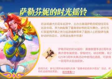 另外再庆典的时候就可以使用萨勒芬妮的时光摇铃这个道具啦,大家到时候可以在三周年庆获得一款一周年庆或者二周年庆的皮肤,分别是「小蜜蜂提莫」和「小蜜蜂努努和威朗普」,如果两款皮肤均已拥有则可兑换其他神秘奖励。
