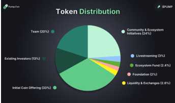 PUMP 代币分配33%:代币发行(含18% 私募、15% 公开销售) 24%:社群与生态建设 20%:团队持有 13%:早期投资人 其他则分配给基金会(2%)、直播推广(3%)、生态基金(2.4%)、流动性与上市支持(2.6%) 等用途