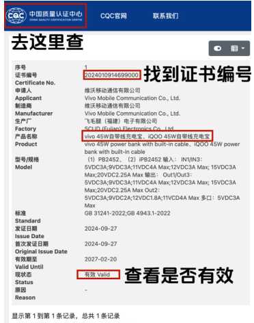 用我这个vivo 45W充电宝举例,问客服要证书编号,输入查看产品信息和有效期(这个很重要) 如果以上都没问题的话,只要容量在20000mAh以下就可以放心带上飞机了~