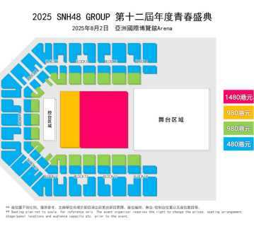 2025SNH48年度青春盛典门票多少钱怎么买在哪买SNH48年度青春盛典门票在cityline、大麦网上售卖, 售票时间:6月23日(星期一)中午12时起售卖 门票价格,内场前区:1480、内场后区/看台:980、看台:480 座位图如下:
