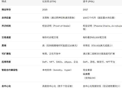 主要区别让我们看看以太坊和波卡之间的主要区别。这将帮助你了解每个项目的独特之处,并找到最适合你的那个。 因素1:速度和交易费用 波卡比以太坊更快且更便宜。ETH交易通常需要3到10分钟,并且在高流量时费用可能达到5美元到30美元。波卡通常在几秒钟内确认交易,并且费用不到1美分。这使得POL非常适合小额支付和频繁交易。 因素2:安全性和去中心化 以太坊是一个非常安全且去中心化的区块链。它在全球成千上万的独立计算机上运行,因此很难被任何人控制或攻击。这个去中心化的程度对于金融和法律用途等领域非常重要,因为在这些领域中,信任至关重要。作为主网络(Layer 1),以太坊为应用提供了一个坚实可靠的基础。 波卡也很安全,但它的去中心化程度还没有以太坊那么高。由于它在以太坊主网络之外处理交易,并且然后将其验证到以太坊,它获得了一些安全性好处。但是波卡的一些部分,比如侧链和桥接,由较少的人管理,这有时可能成为一个弱点。因此,如果你需要更高的安全性和信任,以太坊通常是更安全的选择。 因素3:生态系统和开发者支持 以太坊是区块链领域最大开发者社区的所在地。凭借坚实的工具、协议和基础设施,它是创建复杂去中心化应用的最佳选择。像Uniswap、Aave和OpenSea这样的知名项目起步于以太坊,并随着越来越多的人使用该网络而不断发展壮大。 波卡是一个相对较新的网络,但它发展得非常快。它吸引了新项目以及从以太坊迁移过来的项目。其一个关键优势是完全兼容以太坊虚拟机(EVM),这意味着开发者可以使用相同的工具和智能合约,几乎不需要任何改动。这就是为什么它对那些希望快速扩展而又不放弃现有工具或无法获取以太坊庞大用户基础的开发者来说是一个好选择。 以太坊和波卡对比以下是清晰的表格,展示了以太坊和波卡之间的关键技术和战略差异: