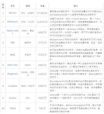 加密货币角色越多,效用与价值越大当一个加密货币能够作为的角色越多,他对于该生态系所带来的效用与价值越大,通常也就更有投资价值; 例如,某个加密货币可能同时有手续费支付减免、参与特定专案分享收益的支付单位好处,或者某个加密货币可以做为启动智能合约以及手续费支付的角色。 每一个加密货币它的功能意义都是独特的,如果有兴趣得花时间去研究。 但如果你阅读完白皮书之后,仍旧没办法理解该加密货币的角色,或者是没有办法找到两个以上的角色,你就应该考虑别的加密货币来投资。 为什么会说,当一个加密货币能够担任的角色越少越不该投资呢?为了回答这个问题,得先有加密货币流通速度(Token velocity)的概念。 这边的流通速度,某种程度可以对应人们对该加密货币的价值认同程度。当人们持续持有加密货币而不售出,流通性就会很低;相反的若人们售出该加密货币,来交换成其他种加密货币或法币,那么就代表流通性很高。 加密货币有哪些?市值排名统计除了常听到的比特币、以太币之外,其实加密货币的种类还有很多,底下将市值最高的前10名资料整理如下: