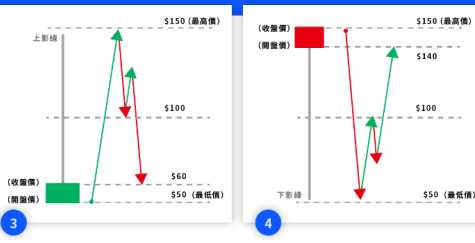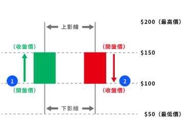 左边 ① 的图形是绿 K线 (又称绿 K 棒),表示收盘价「高于」开盘价。以上图为例,当日的开盘价为 100 元,最高曾涨至 200 元(上影线),最低曾跌至 50 元(下影线),而最终收盘价为 150 元。 右边 ② 的图形是红 K线 (又称红 K 棒),表示收盘价「低于」开盘价。以上图为例,当日的开盘价为 150 元,最高曾涨至 200 元(上影线),最低曾跌至 50 元(下影线),而最终收盘价为 100 元。 用 K 线判断买卖盘力度K线图记录了当日的价格涨跌变化。透过观察 K 线,我们可以判断当天的买盘、卖盘力度,进而推估价格趋势。