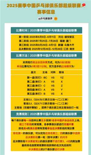 2025乒超赛制已定,2025年乒超联赛迎来重磅升级,采用“三阶段常规赛+总决赛”的全新模式!赛程从6月一直持续到12月,超长周期让球迷大饱眼福,也给各俱乐部足够时间大展身手~乒超联赛2025赛制规则:2025赛季中国乒 ...