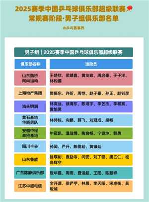 乒超联赛2025有谁参加?2025乒超名单: 男团: 山东魏桥·向尚运动:王楚钦、梁靖崑、黄友政、周启豪、于子洋、林昀儒 黄石基地·华新:林诗栋、向鹏、薛飞、刘冠成、胡畅 汕头明润:林高远、徐海东、陈垣宇、李艺杰、李和宸、黄旭男 上海地产集团:樊振东、许昕、周恺、赵子豪、孙正、赵钊彦 山东鲁能:徐瑛彬、袁励岑、闫安、刘丁硕、唐乙仁、松岛辉空 四川丰谷:孙闻、严升、陈俊菘、黄镇廷 江苏中超电缆·迎福台:全开源、梁俨苧、林晨、李天阳、宋卓衡、吴晙诚 安徽中程单招基地:牛冠凯、温瑞博、陶育畅、宁贤坤、郭勇 广东陈静俱乐部:敖华磊、周雨、费浚航、王阳、陈颢桦