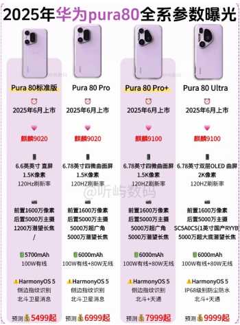 华为p80和mate70pro畅享版对比外观设计 • P80:采用6.7英寸OLED曲面屏,背面使用纳米微晶玻璃,有“星轨纹理”工艺。 • Mate70Pro:屏幕为6.9英寸,标准版是直屏,Pro版为等深四曲面OLED屏,采用超可靠玄武架构,有昆仑玻璃,外观设计更偏向商务风。 性能表现 • P80:搭载麒麟9100处理器,配合鸿蒙星河版操作系统,CPU多核性能提升25%,GPU图形渲染效率提升35%。 • Mate70Pro:全系搭载麒麟9100处理器,性能接近骁龙8+Gen3,AI能力和基带性能显著提升,预装HarmonyOS NEXT系统。 影像系统 • P80:主摄采用与豪威联合研发的OV50X传感器(1英寸大底),三摄模组支持从微距到10倍光学变焦的全焦段覆盖,AI算法可自动识别200+种拍摄场景。 • Mate70Pro:主摄为5000万像素可变光圈镜头,搭配潜望式长焦和超广角,支持红枫镜头优化色彩还原,Pro+版本新增4800万像素超广角镜头。 电池续航 • P80:电池容量4500mAh以上,支持100W有线快充与50W无线快充。 • Mate70Pro:Pro版电池容量5880mAh,支持100W有线快充和50W/80W无线快充。 其他方面 • P80:标配5.5G网络,下载速率提升至10Gbps,时延低至1ms,自研超声波屏下指纹识别技术,识别速度达0.2秒。 • Mate70Pro:支持卫星通信(图片消息功能)和灵犀通信技术,有侧边指纹识别、3D TOF面部识别及隔空手势操作等 发布时间:mate70pro已经发布,p80到6月11号正式发布 |