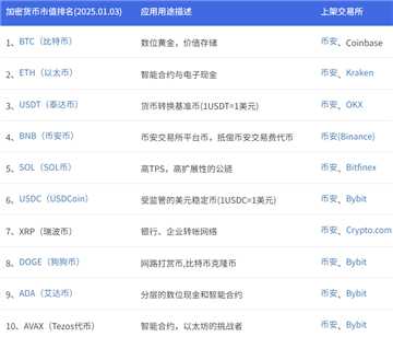 2025年加密货币市场大牛市中,再次出现了BNB(币安币),SOL(索尔币),DOGE(狗狗币)等黑马币种,币排行总结了目前数位货币排行前10名币种,以下用一句话解释2025热门数位货币的应用用途,推荐主流加密货币交易平台上架币种。