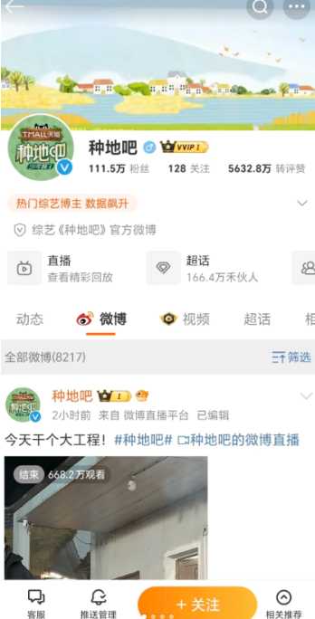 种地吧直播在哪个平台1. 直播平台 第一季:微博,抖音 第二季:微博,抖音, 爱奇艺 第三季:微博,淘宝直播(目前) 注:前两季抖音画质更好,第三季淘宝直播画质更好。如果拿手机的是两个人,不同平台直播视角会不同,如果是一个人,视角差不多 2. 直播账号 微博 :“种地吧”账号(图1)