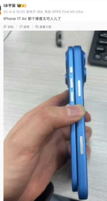 该博主此前称 iPhone 17 Air 含摄像头凸起总厚度 9.5mm(凸起 4mm,机身 5.5mm),与分析师郭明錤报告一致。对比现款 iPhone 16 Pro Max 厚度 8.25mm(不含凸起),若 Pro Max 保持现款尺寸,Air 厚度确可实现“减半”。 规格方面,消息称该机配备 6.6 英寸 120Hz ProMotion 灵动岛屏幕,搭载标准版 A19 芯片(非 A19 Pro),配备自研 C1 基带芯片。