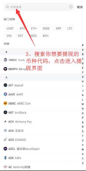 2、在币种搜索界面输入你想要提现的币种简称,或者直接在热门币种内点击你想要提现的币种,点击进入提现详情界面。