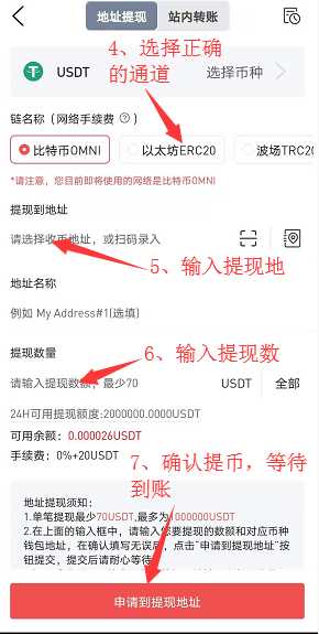 3、通道一定要选择正确,比如ERC20,只能输入ETH协议的地址,一般是以0x开头,TRX一般是以T开头,输入错误,将会有丢币的风险;提现地址一般是指你充币的地址,比如钱包、其它交易平台等,全部输入完成后,确定提币,输入有效的验证方式(比如:手机验证码、邮箱验码、谷歌验证码等),等待官方审核放币,待确认数量达到要求,即可到账你想要提至的账户。