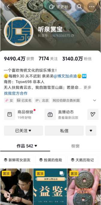听泉鉴宝在哪直播抖音。 想要关注的小伙伴们可以直接抖音搜索名字关注,或者搜抖音号也是可以的。