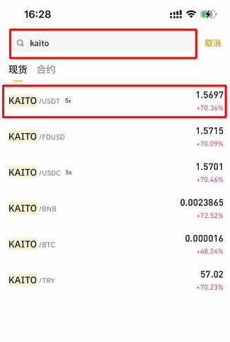 3、输入【bera】,这时下拉会显示现货BERA / USDT,点击【KAITO / USDT】。