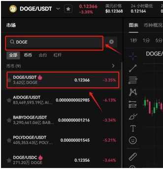 11、在搜索框输入DOGE,选择DOGE/USDT交易对,可以看到DOGE实时行情