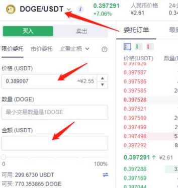 买入狗狗币,填写价格,如目前是0.397,但你想在0.38 USDT价的时候购买,价格填写0.38 USDT即可