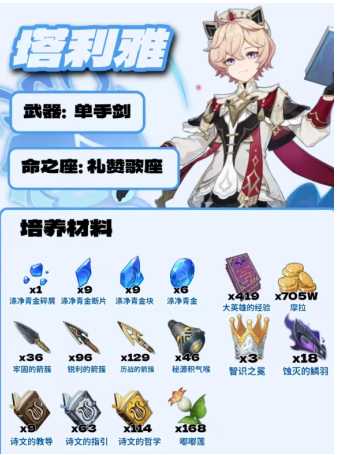 原神塔利雅材料即将于6月18日随5.7版本上线啦,作为四星水系单手剑角色,隶属蒙德西风教会,担任助祭一职,很多小伙伴准备抽卡的,那原神塔利雅培养材料有哪些呢?值得抽吗?下面就和小编一起来看看吧。