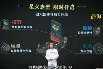 星火赤壁的核心玩法星火赤壁的核心玩法主要有两点: 第一,星火赤壁跟双人同行玩法一样,也是一人掌舵(控制方向),一人攻击。 第二,控制攻击的人还可以为船上的四大核心部件进行升级,在升级后船的视野、质量、操控和火力都可以得到较为明显的提升。