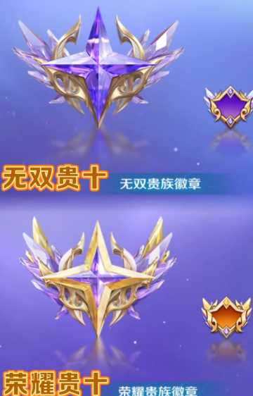 王者荣耀v10荣耀贵族和无双贵族标志图片区别徽章区别:无双贵十紫色元素较多,荣耀贵十带一些金色元素!