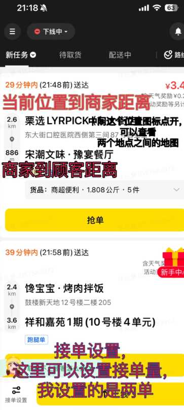 4,设置同时接单量。美团众包派单有两种方式,一种是自己抢单,另一种是系统派单,不管哪种方式,新手都不建议多接。这里就可以设置同时接单量(图片p3)。同时派单量新手最多可以设置四单,我设置的是两单(p6) 这里有一个技巧,如果害怕系统派的单多了,可以接完自己想送的单之后,立马点下线,就不会给你派单了。下线之后之前接的单不受任何影响,正常送就行。