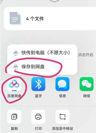 2.打开至单个文件,长按选取(一次可选多个文件) 3.点左下角“发送”——百度网盘——保存至网盘;