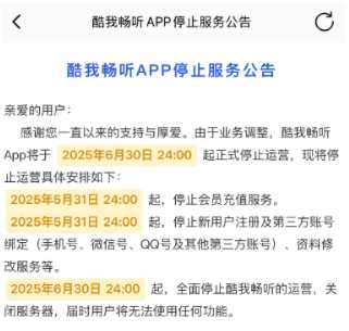 酷我畅听要停止运营吗?倒闭了吗?近日小编看到了酷我畅听APP停止服务公告,2025年6月30日24:00起正式停止运营,那会员没到期怎么退款呢?下面就和小编一起来看看酷我畅听停止服务的相关信息。
