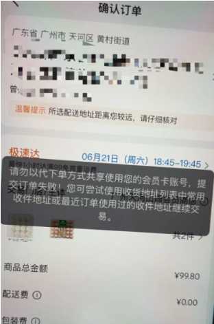 近日不少山姆会员反馈主卡下了三单就提示交易提示,称有代下单的嫌疑,根据山姆最新代下单规则,一个月内下单已经超过6单的账号,限制下单新地址,这点大家还是需要注意的,小心自己的账号被封。