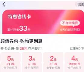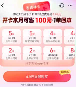抖音的特惠省钱卡大家有开通过吗?想要买东西的时候满减的优惠还是很划算的,一个无门槛的全平台满减券就已经回本了,不过也有的小伙伴在开通之后想要关闭,找不到关闭的通道,下面就一起来看看吧。