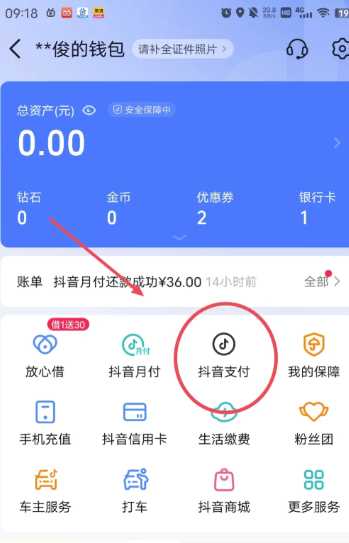 2,找到 【我的钱包】, 3,进入钱包 -> 找到 【抖音支付】 (点进去!)
