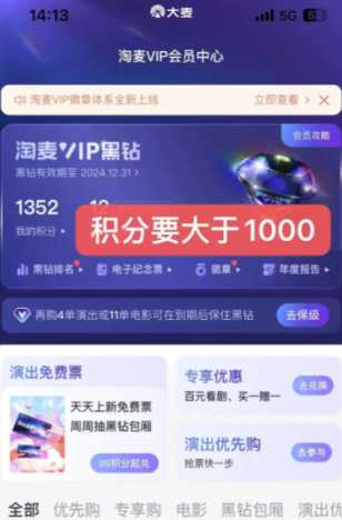 淘麦vip专享购抢得到票吗不一定的。 首先专享购不是优先购,不能提前抢,只是有专属通道,其次专属通道的票是小于中奖人数的,所以也有可能抢不到。 淘麦vip专享购和普通购的区别有些场次演唱会,大麦开辟的专享购买通道,要提前报名抽奖,抽中了就有购买资格(注意是资格),另外必须是大麦黑钻会员,在演唱会购票界面或者会员报名,一般在抢票前2小时开奖,中了奖就去专享购赛道抢票,这个赛道不是必有票,只是买到票的几率大一点 淘麦vip专享购抢票流程第一步: 打开大麦app,进入首页,找到会员按钮,点击会员。 第二部:进入到会员的界面。可以看到淘麦VIP,如果那种刚注册的新号,或者没抢过票的,是没有会员的,就没办法抽奖。需要是vip黑钻,同时积分>1000,不然没办法抽优享购。