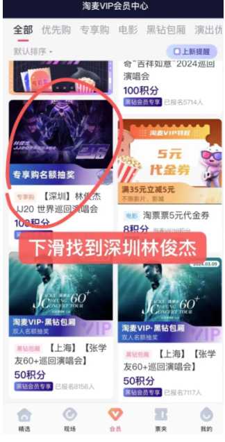 这里以林俊杰演唱会为例,大家看一下抢购的流程: 第三步:下滑找到深圳林俊杰。点进去。