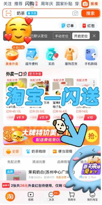 淘宝闪购免单幸运值在哪里看打开淘宝app,点击右下角的闪购进入;