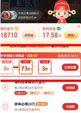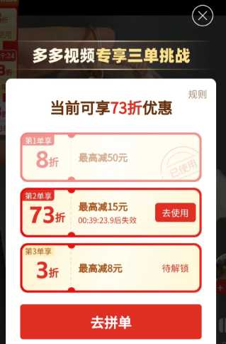 拼多多三单挑战怎么搜索想买的东西呢如果三单挑战里没有找到自己想要的商品,退出去多点几次想要的商品(最好再点个收藏),再进入三单挑战平台就会推送自己想要的商品或者类似商品。大家可以根据自己的商品选择合适的折扣拍,比如你就想买个50元商品,你可以先随便买个商品完成第一单,然后再通过第二单(75折)买你想要的50元商品 |