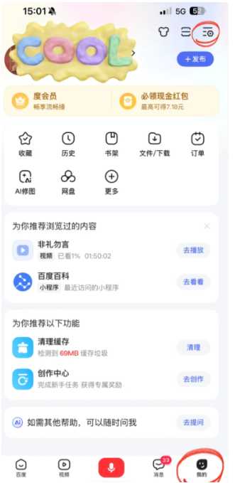 百度猜你想搜的功能怎么关闭升级为最新版App。打开app-我的-(右上角)设置-首页设置-工具首页。返回就得到了图6干净清爽的app首页了。 选择设置