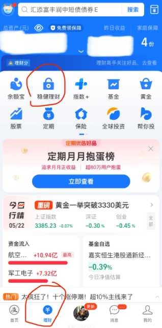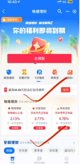 2,进来【稳健理财】先领个红包,有些产品是有平台补贴的,这个就像淘宝发的平台满减券; 3,点下面的【安稳理财】,里面都是支付宝平台严格挑选的基金;