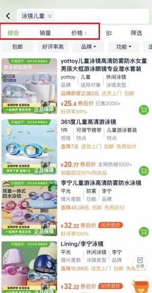 再比如小编搜泳镜,下面就没有半日达的选项,说明这个商品就没有半日达哈;