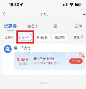 支付宝碰一碰红包怎么用需要再碰一下的设备上直接使用就行了,不过大家在使用的时候看一下要求,有的要求是在指定的店铺使用,有的是没这个要求,只要有碰一下的设备,付款的时候就直接抵扣了。 支付宝碰一碰红包薅羊毛教程就是买东西如果遇到有碰一碰获得无门槛立减的店的话,可以先结账一个东西碰一下,就获得了无门槛优惠券,然后继续结账剩下的东西,不然这个优惠券不用就过期了 |