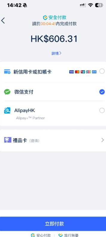 3,支付方式可以选择微信,银行卡。支付宝看着是香港的支付宝,所以不确定大陆是否可以支付(如p4)。微信支付非常的丝滑,但是需要在支付界面点击更多支付的箭头才有显示。