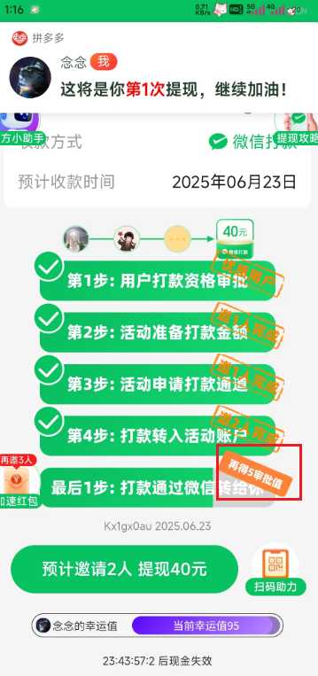拼多多现金大转盘提现技巧本来好不容易拉了十几个人助力,结果发现还是熟悉的套路。我想着提现600元应该不算难,谁知道抽完提现额度,又冒出个审批值要抽。越想越气,就找拼多多客服理论了一番。神奇的是,刚和客服聊完,再打开拼多多,突然多了几次抽奖机会,直接就提现到账600元!简直不可思议,拼多多助力互相