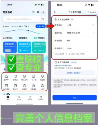 Step2: 填信息+看雪峰干货 • 录入成绩、省份、选科,建好个人档案; • 戳「张雪峰志愿课」,听专业解读、院校分析,跟紧大佬思路填志愿!