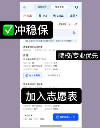 Step3:智能匹配+冲稳保 系统自动算分,按「冲/稳/保」推荐院校,选「院校优先」或「专业优先」筛选项,挑中直接一键加志愿表,数据准、效率高,雪峰认证靠谱!