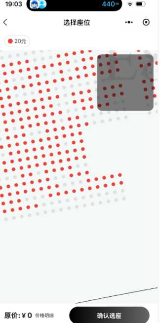 4,:在选座界面,一定要放大,放大,放大,直至看见密密麻麻的点,灰色的点就是售出了,红色的点就可以选。看到红点就点,不要犹豫,犹豫就会被别人抢走,好不容易走到这一步,从现在开始到付款必须一气呵成,不能停一点!!!