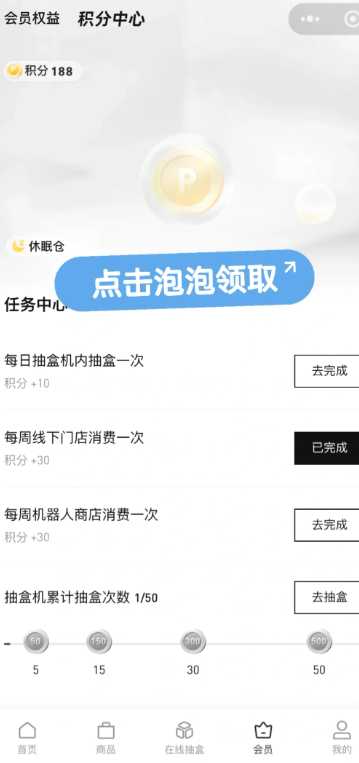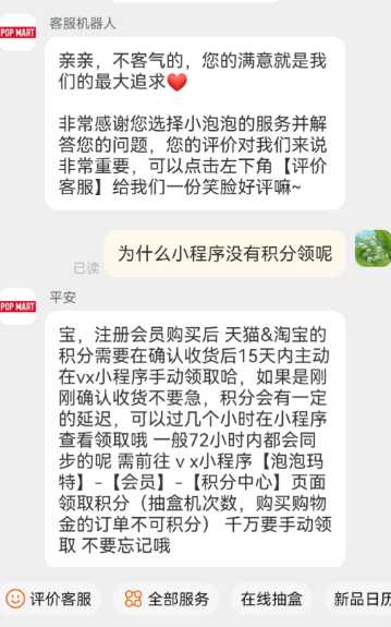 另外再买了盲盒之后,收货之后也是可以领取积分的,但是注意这个是手动领取的哈: 积分需要在确认收货后15天内主动在微信小程序手动领取哈,如果是刚刚确认收货不要急,积分会有一定的延迟,可以过几个小时在小程序查看领取哦一般72小时内都会同步的呢 需前往VX小程序【泡泡玛特】-【会员】-【积分中心】页面领取积分(抽盒机次数,购买购物金的订单不可积分) 千万要手动领取不要忘记哦