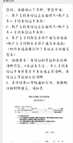 网易支付实名认证不是本人怎么修改先说一下我的情况,前段时间在藏宝阁上卖了一个账号发现网易支付实名不是自己的是手机号前号主的,钱提不出来。要想改实名的话只能联系原号主注销账号,联系不到,所以去找了客服解决。 首先去网易支付设置—安全—自助申诉—身份信息申诉—变更类型选其他,就可以联系客服,多喊几遍就会有人工客服。记得要说是他人赠送,不要说是线下交易!说线下交易的话,如果原号主联系不上是不给处理的 然后向客服说明情况,客服确认后会叫你提供资料,大概就是一些基本信息和手机号入网证明,大概几天审核通过以后会给你发送一个文件如图让你补充资料,填了然后手持拍摄上传就可以了。