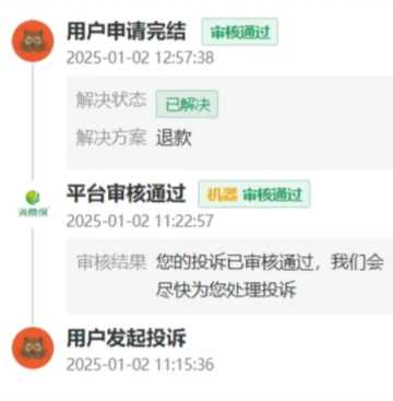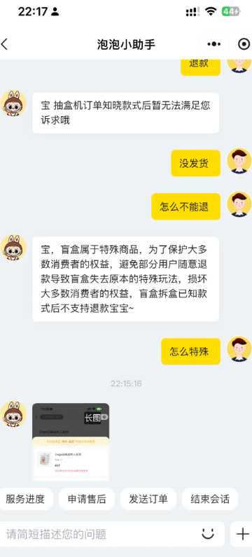 但网上也有小伙伴退款成功的,大家可以看一下相关的细节: 1 月 2 号,我满心欢喜地在泡泡玛特抽盒机买了 crybaby 系列,本想着坐等可爱的娃到家,结果左等右等都没发货。我就不想要了,就申请退款,结果商家直接不同意。 行,我找客服协商,客服说在审核中,可我眼睁睁看着别人几分钟就退款成功了,为啥到我这儿就得等好几个小时啊? 上次有个姐妹说在消费保提交,立马就能解决,抱着试一下的态度,结果!!真的很快帮我解决了,消费保,还得是你啊!