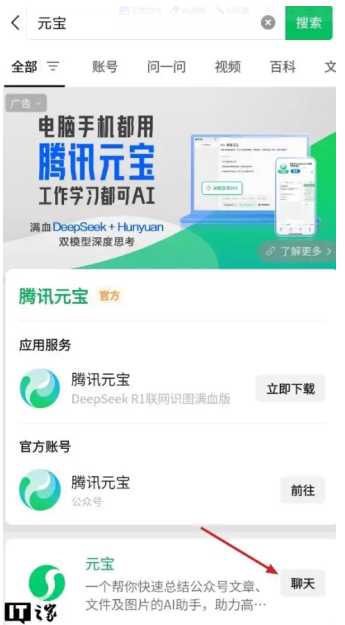 方法二:在微信搜索“元宝”,即可找到“聊天”入口,点击进入;