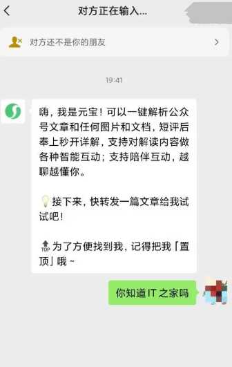 微信用户可以在聊天对话框中,与元宝进行实时交流,输入对话内容后,元宝甚至会提示“对方正在输入...”,就像真人聊天那样。